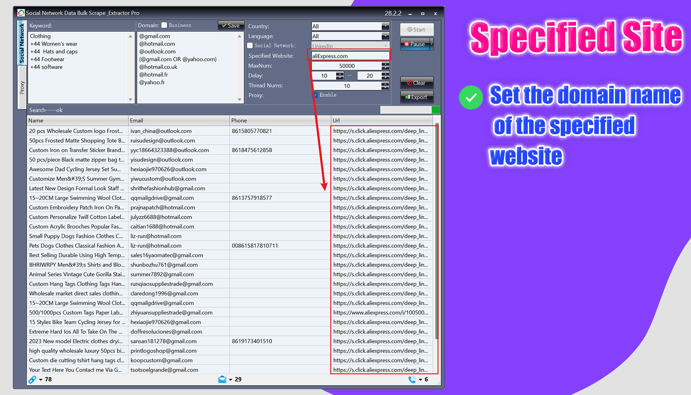 After typing your keywords, just click the "start extract" button. The software will automatically extract the email list using advanced techniques from various online social media platforms.